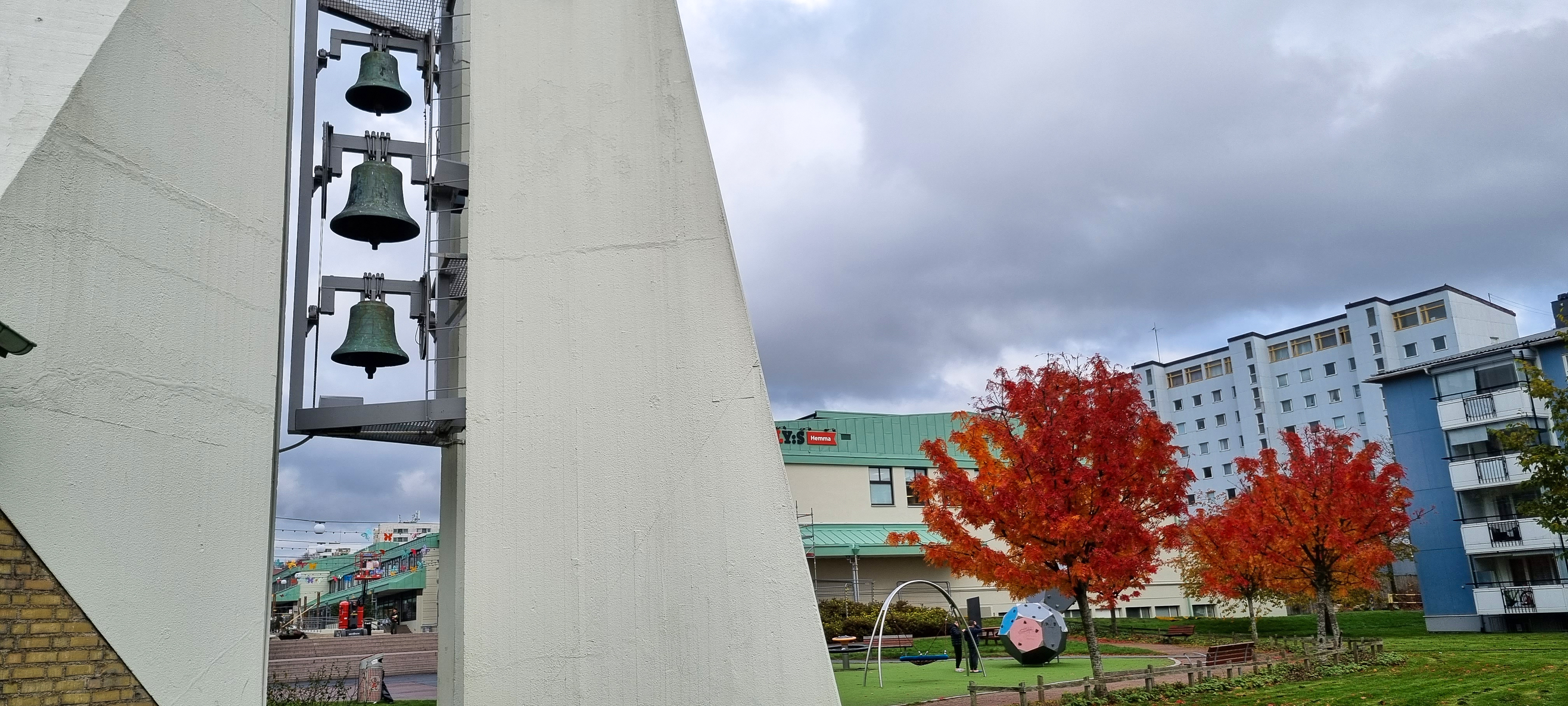 Församlingsdelen med en öppen atriumgård, uppfördes ursprungligen med ett svagt lutande tak klätt med kopparplåt, vilken fortsatte som plåtgesims ned till fönstrens överkant. 1989-93 skedde en om- och tillbyggnad med flera exteriöra förändringar. Taket fick en brantare lutning och takfoten drogs ut över en panelklädd gesims. Atriumgården övertäcktes vid samma ombyggnad med en förhöjd ljuslanternin. Vissa för byggnaden karaktäristiska förskjutningar i fasaden försvann genom lokala tillbyggnader.