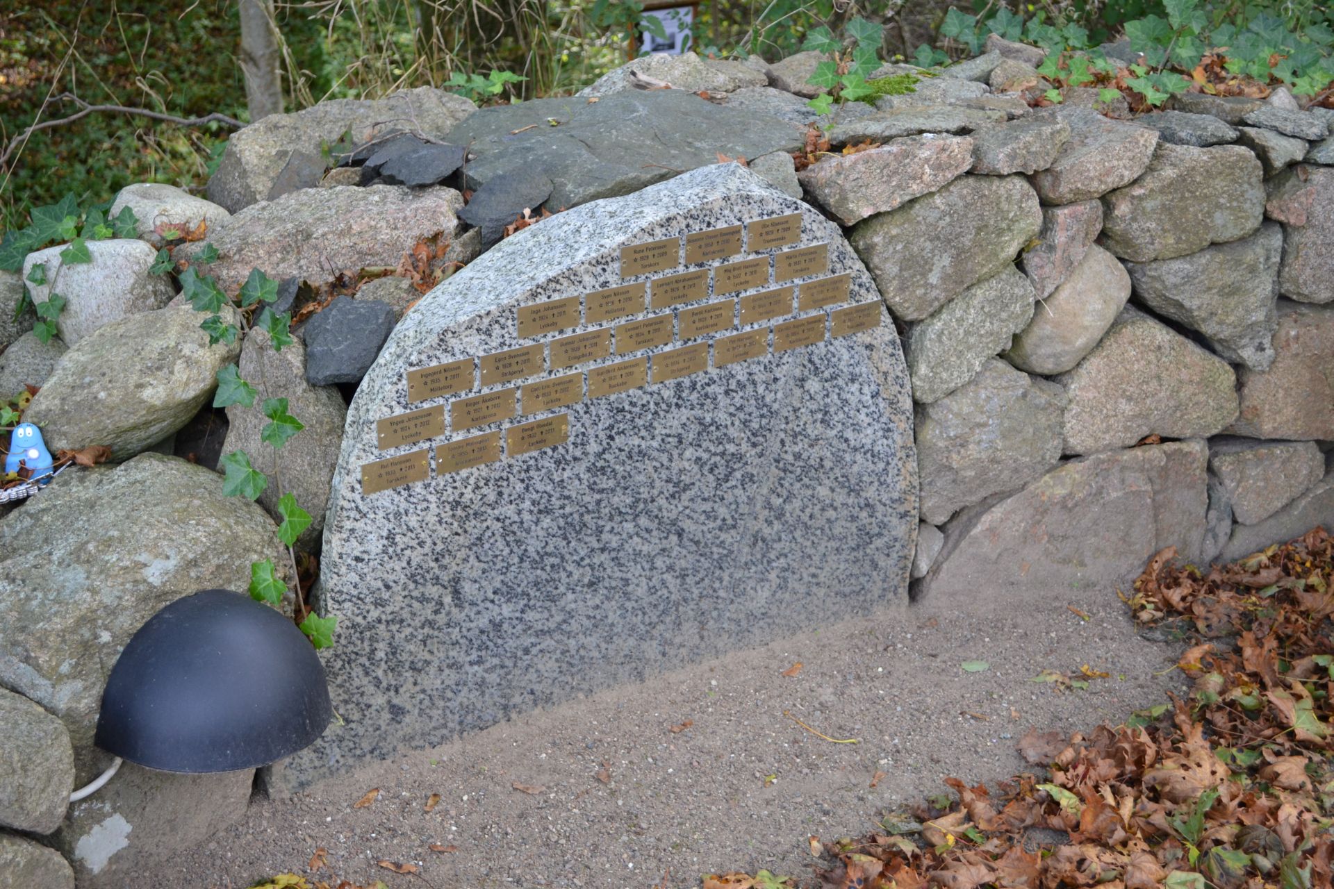 - den avlidnes aska markeras med namnplatta på en gemensam namnbärare.