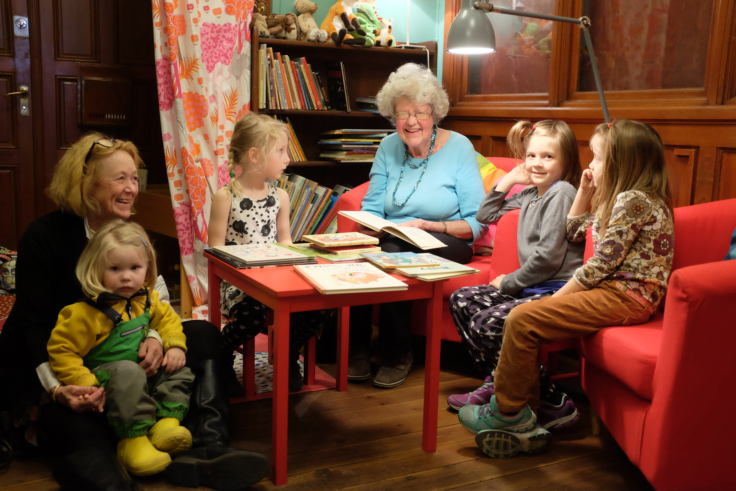 Här vill vi bidra till den urgamla traditionen med högläsning. I vårt barnbibliotek, inrett i glada färger håller vi den muntliga traditionen levande med sagoläsning för barn. Högläsning bidrar till nya samtalsämnen och - inte minst - barnen får lära sig att njuta av en god historia! I samband med bokläsningen pratar vi om berättelsen och barnen får hjälp att göra egna reflektioner.