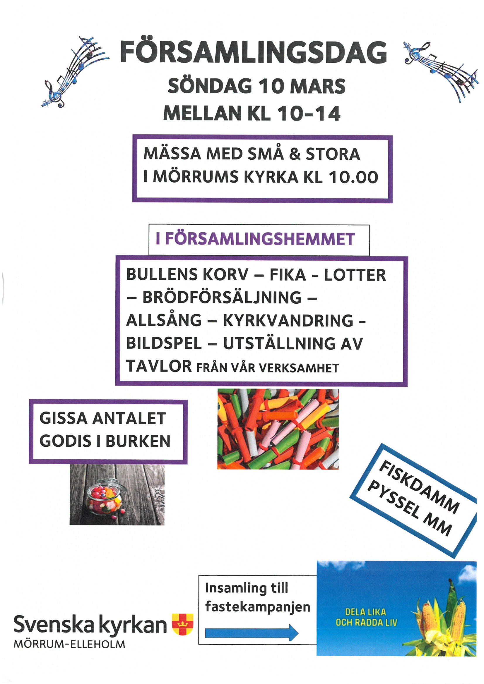 Vi fortsätter i församlingshemmet med bullens korv, fika fiskdamm, lotter, brödförsäljning, allsång, bildspel, kyrkvandring mm. Till förmån för fastekampanjen: Dela lika och rädda liv.