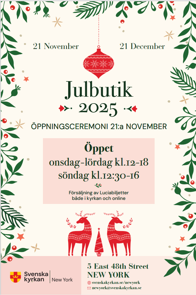 Invigningsceremoni med mingel fredag 21 november kl. 12:00-12:30, Sveriges generalkonsul i New York Erik Ullenhag öppnar butiken. Därefter öppet till 18:00.