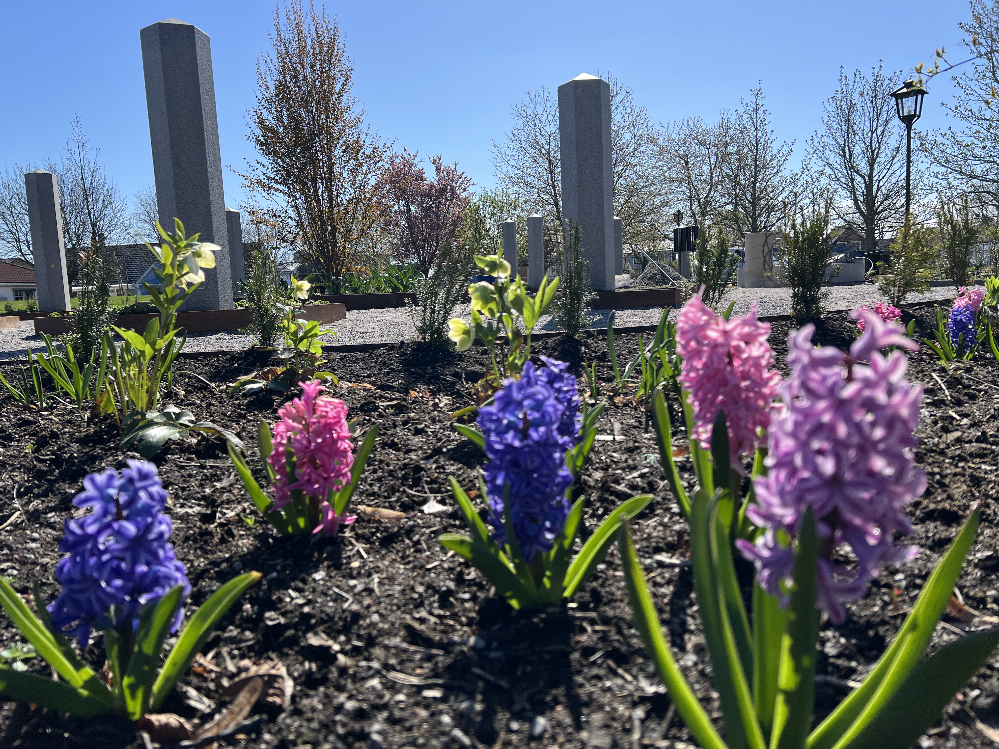 Just nu pågår de allra sista arbetena med att borra hål för plaketterna och planera de sista buskarna i rabatterna. Men redan nu kan kyrkogårdsbesökarna njuta av blommande hyacinter i olika färger. Ett särskilt inslag är ett nyplanterat träd av lite ovanligare slag, en ungersk ek, Quercus frainetto. Den kommer att bidra till platsens karaktär under en lång tid framöver. Centralt finns också en ett rogivande vattenfång med porlande vatten, som skapar en lugn atmosfär. I den nya askgravlunden finns 14 nya pelare som förses med plaketter med de gravsattas namn.