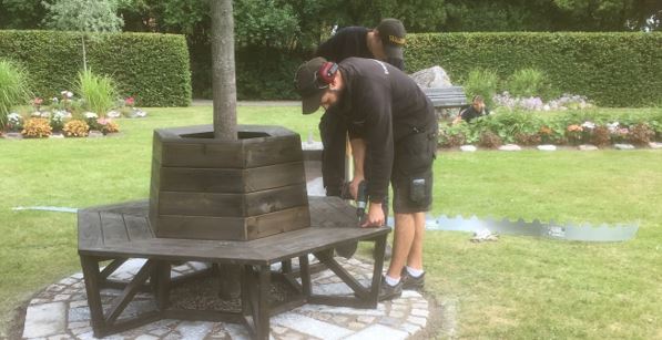 Vi är glada över att ha flera duktiga hantverkare i vårt arbetslag. Här ser vi kyrkogårdsvaktmästare Einar Dahl, som efter egen ritning tillverkat den vackra "kyssbänken" runt eken i askgravplatsen på Nybro kyrkogård. Einar, och hans kollega David Olsson, har även gjort arbetet med stensättningen under bänken. Varmt välkomna till kyrkogårdarna i Nybro pastorat!