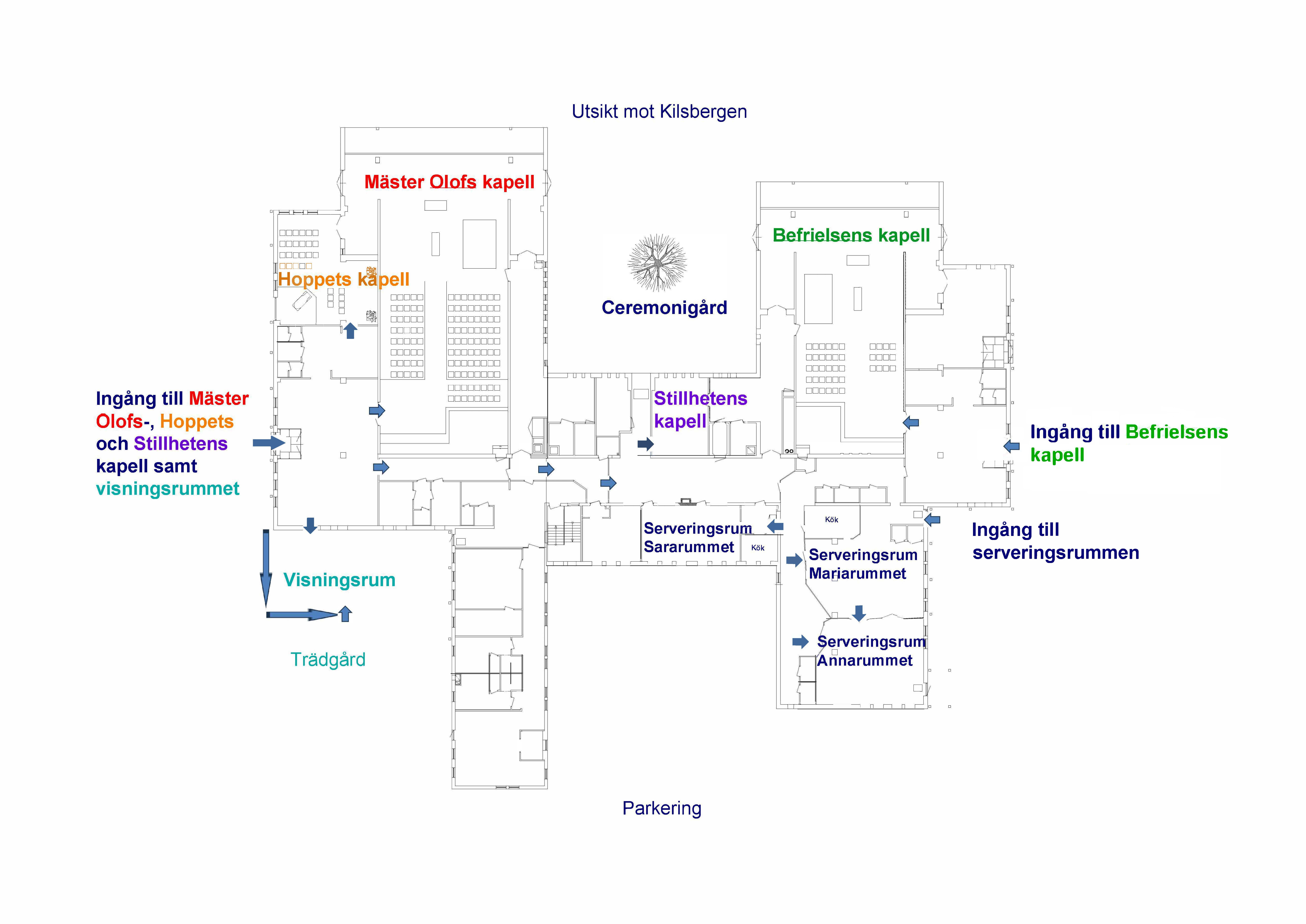 Det finns tre serveringsrum: Annarummet, Mariarummet och Sararummet iordningställda för minnesstunder. Man kan välja mellan att själv ordna med servering eller hyra in någon cateringfirma.