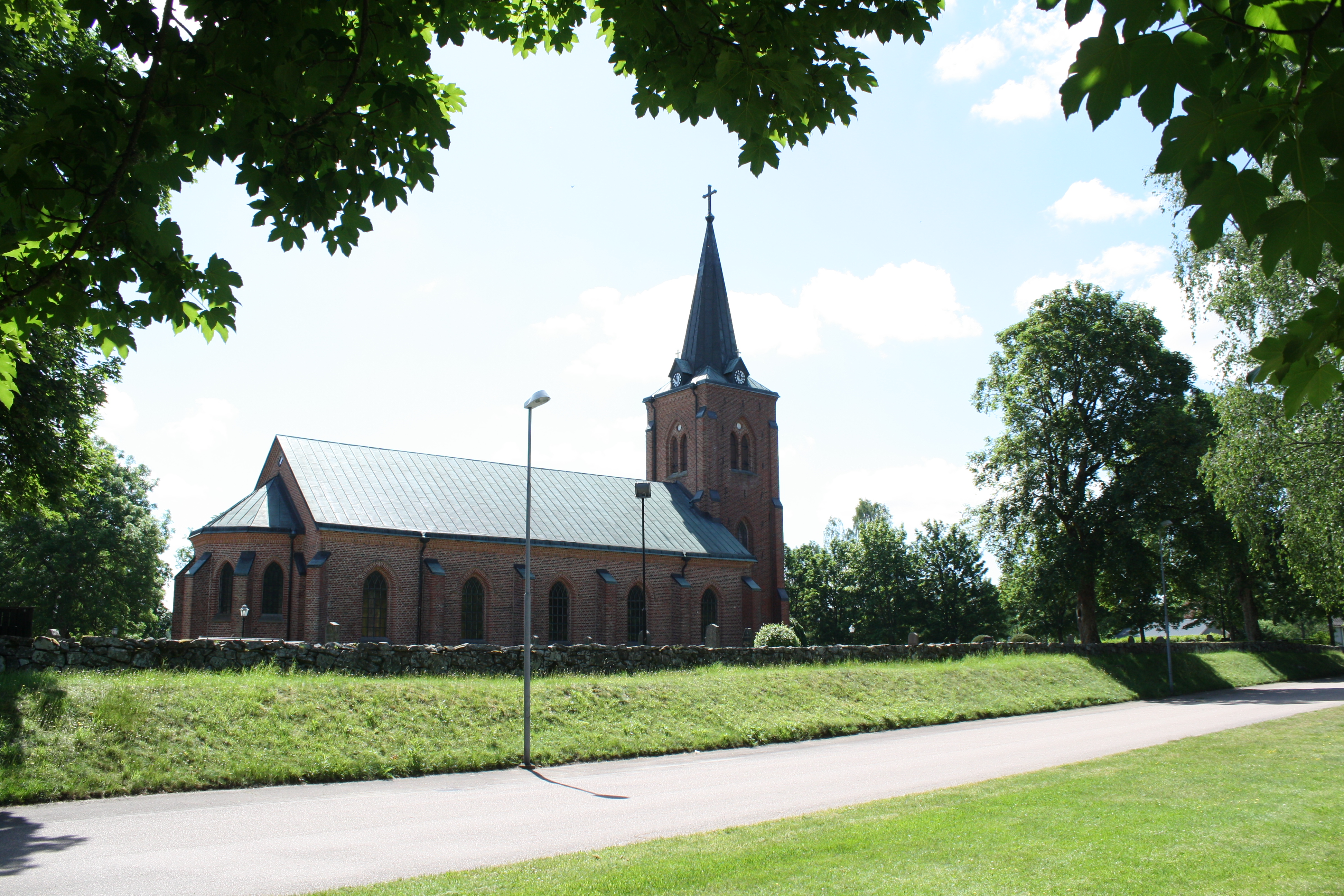 ekonomihus till kyrkogårdsförvaltningen. Sydost om kyrkan är en trädridå i