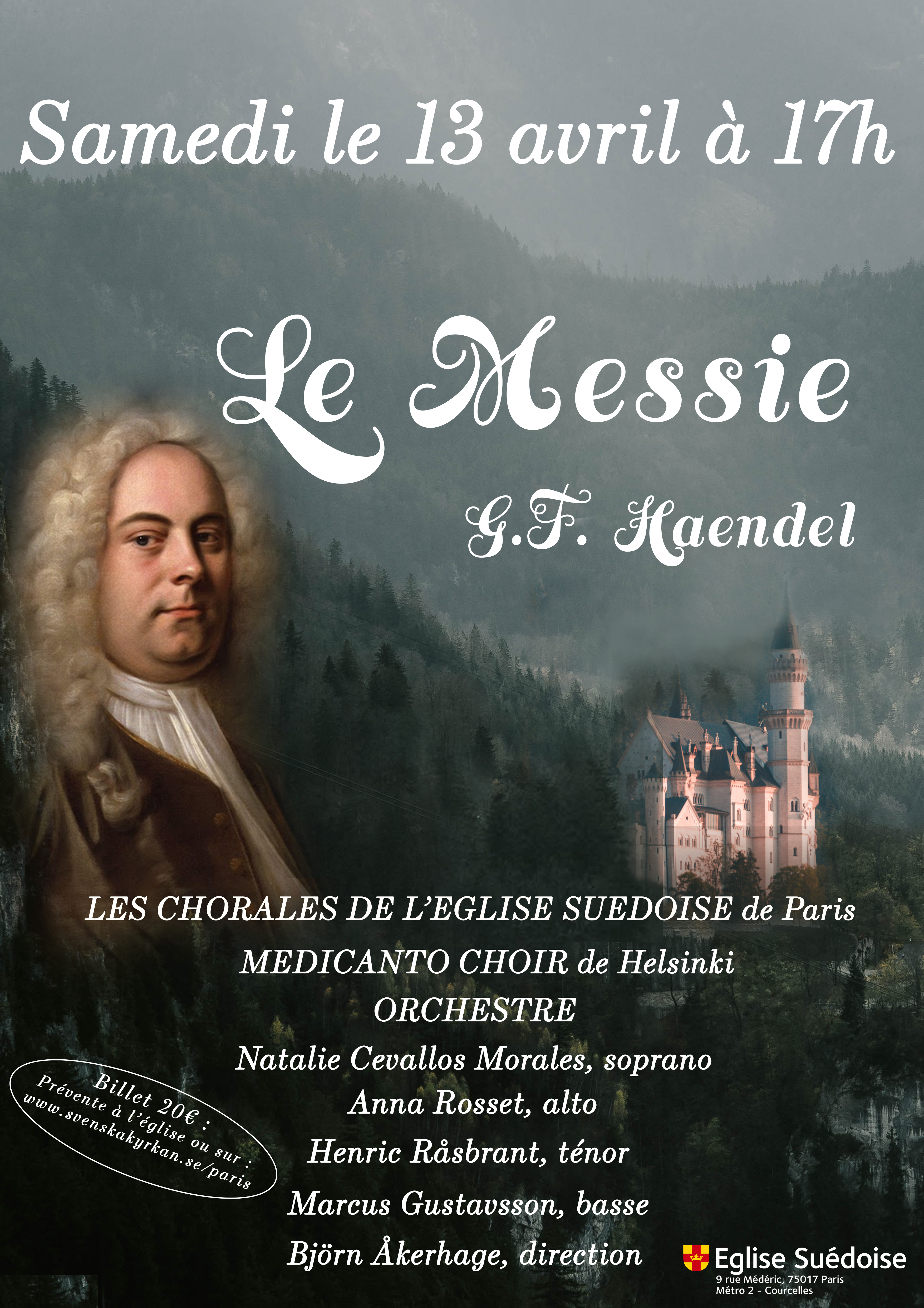 Missa inte körer och solister som framför Händels Messias denna lördag eftermiddag. Efteråt erbjuds dryck och snacks i församlingssalen. Det går bra att köpa biljetter strax före konserten, i kyrkans vapenhus. Vous pourrez acheter vos billets de dernière minute dans l´entrée de l´Eglise.