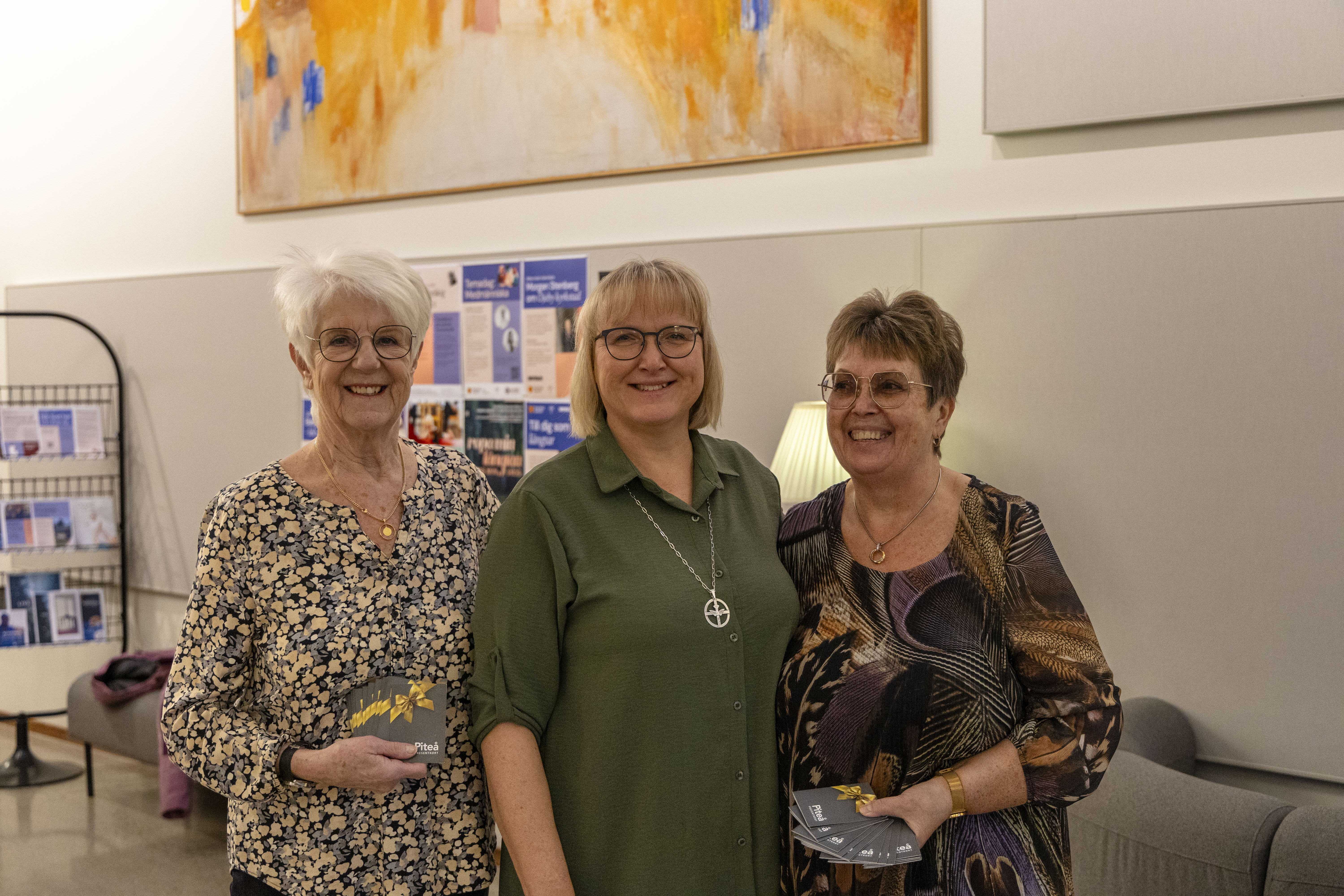Pengarna, 16 400 kronor uppdelat i presentkort, ska användas under det kommande året till arbetet med kvinnor och barn. Rebeckalogen vill stötta och hjälpa familjer i Piteåområdet genom gåvan. På bilden tar Anna-Stina Eriksson, diakon i Piteå församling, emot presentkorten av Siv Hansson och Inger Holmström.