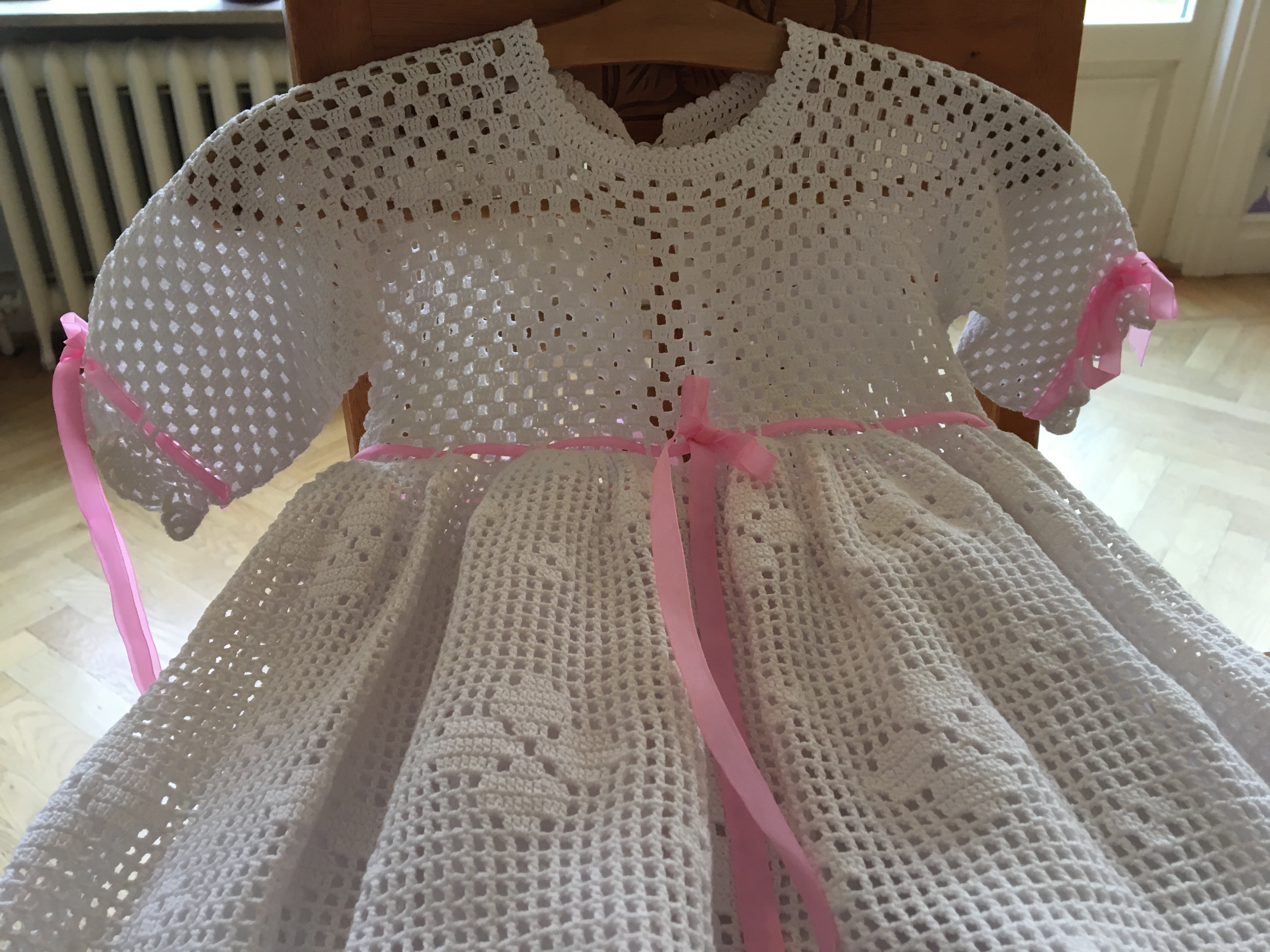 Dopklänningen är skänkt av Enhild och Sven Salomonsson och virkad av Ingeborg Palmberg i Holmsjö.