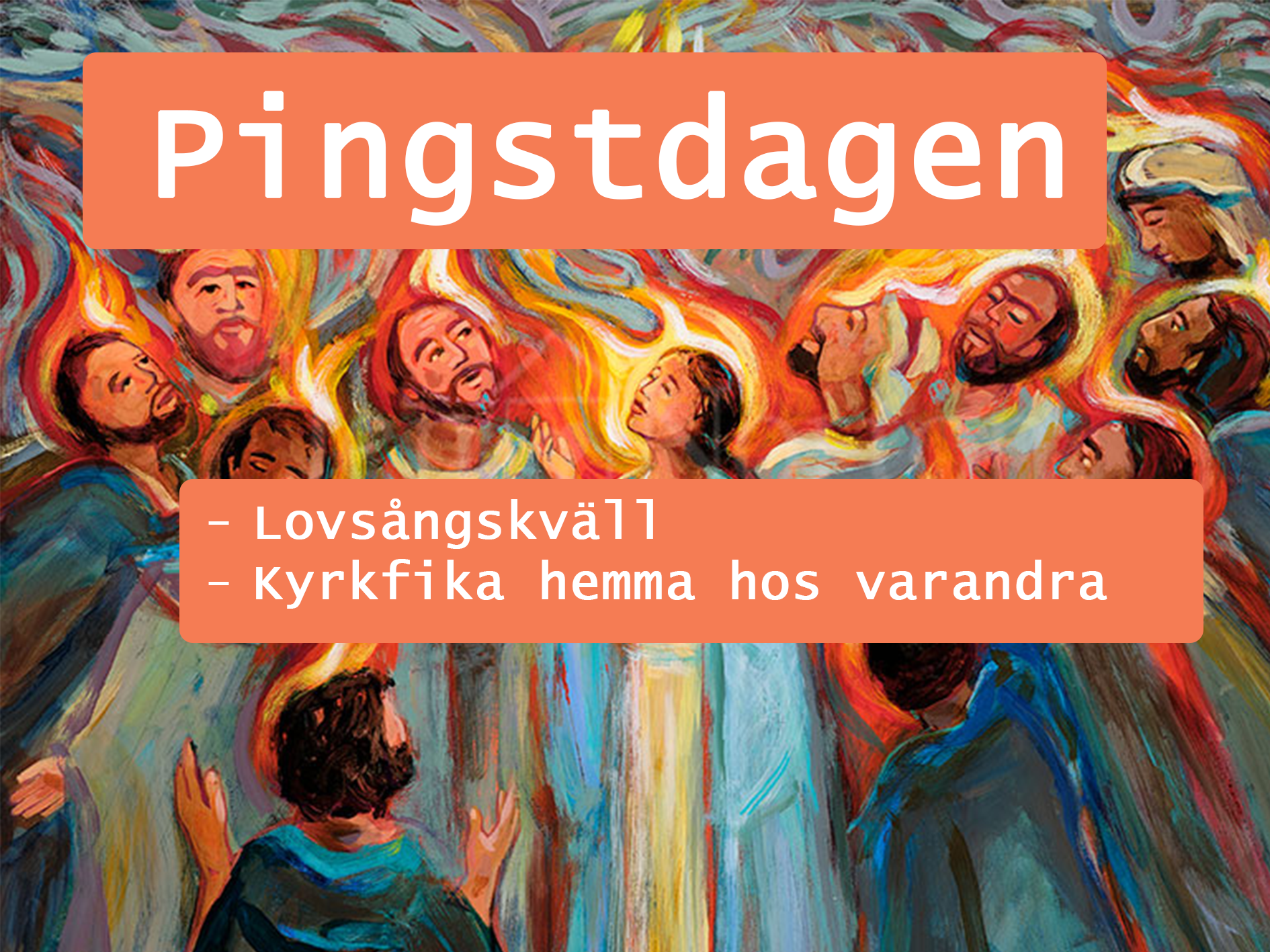 På Pingstdagen den 19 maj är det mässa kl 10 med fokus på Pingstens under av att Gud kommer oss nära. Därefter satsar vi extra på gemenskapen genom att organisera kyrkfikat hemma hos varandra. Det är alltså inget kyrkfika i församlingshemmet den dagen utan hemma hos varandra.