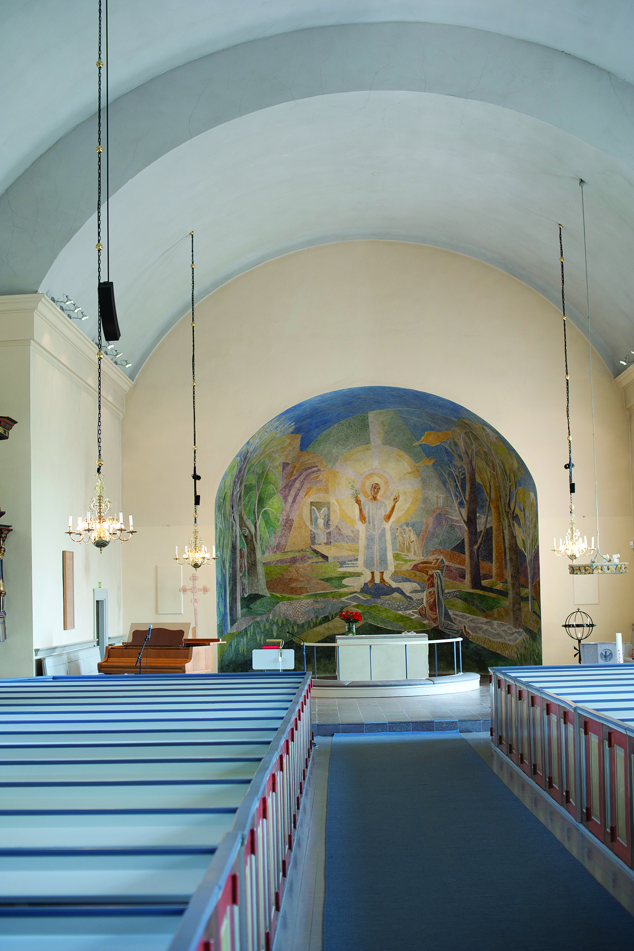 ... på 1840-talet var en byggnad i tidens så kallade ladustil, alltså ett rymligt tunnvälvt kyrkorum, helst utan markerat kor. Genom att sakristian och delar av norra väggen bibehölls blev dock koret både smalare och lägre än långhuset. I korabsiden togs upp ett högt rundbågigt fönster, och på altaret framför detta placerades ett stort förgyllt träkors med skulpterad svepduk – en vid den tiden inte ovanlig altarprydnad. Vid en kyrkorenovering 1950 flyttades korset till sin nuvarande plats vid södra väggen, och i absiden utförde konstnären Gunnar Torhamn den stora målningen, framställande Jesu uppståndelse, som nu dominerar intrycket av koret.