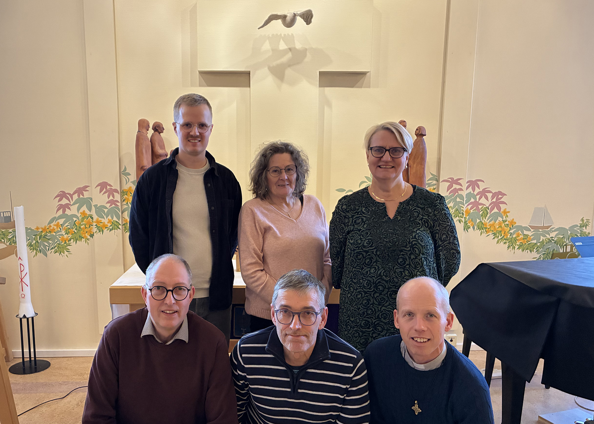 Styrelsen består av (övre raden fr vänster) David Lindgren, Carina Warg och Elisabeth Löfgren, (nedre raden fr vänster) Bengt-Olov (Boa) Andersson, Gunnar Johansson och Johan Holmgren (adj samarbetskyrkopräst). Ej med på bilden: Nils Lundqvist.