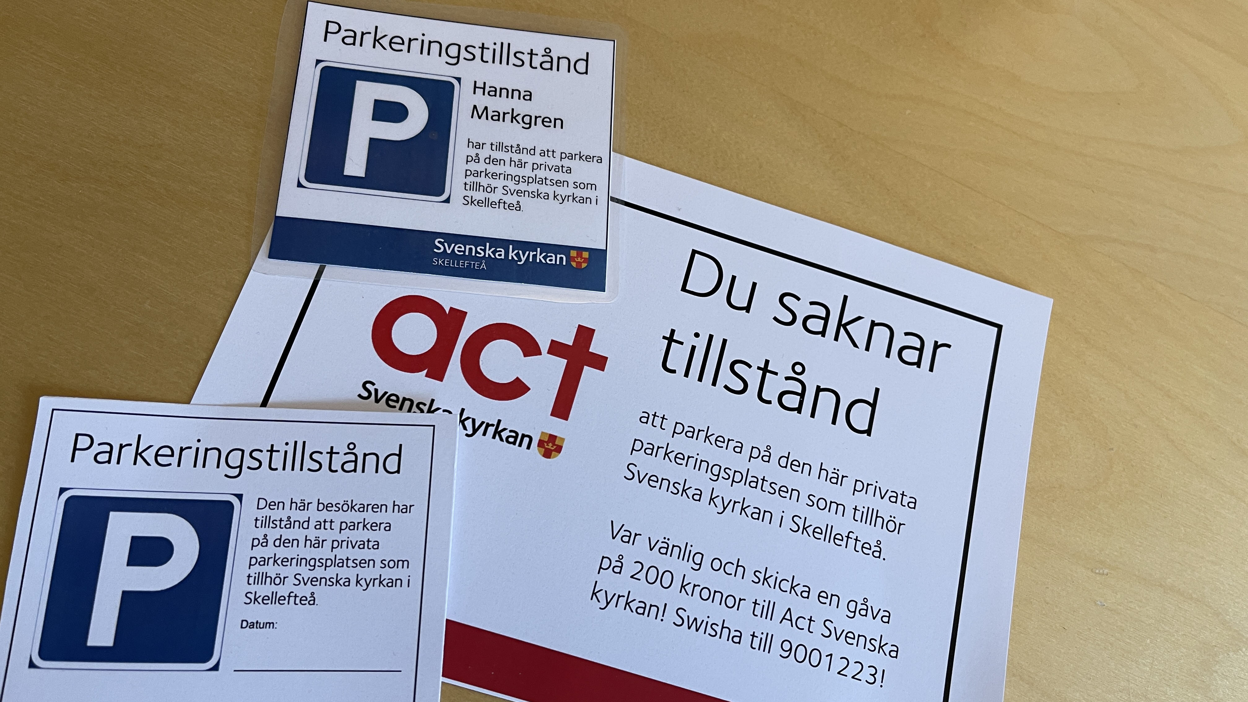 När det noteras att obehöriga parkerar på personalparkeringen, läggs en upplysning om att parkeringsplatsen inte är allmän, samt en uppmaning att lämna ett bidrag till Act Svenska kyrkan.
