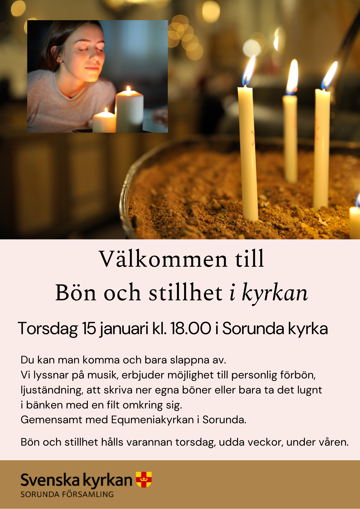 Hit kan man komma och bara slappna av. Vi lyssnar på musik, erbjuder möjlighet till personlig förbön, ljuständning, att skriva ner egna böner eller bara ta det lugnt i bänken med en filt omkring sig. Hålls gemensamt med Equmeniakyrkan i Sorunda (Gudbykyrkan).