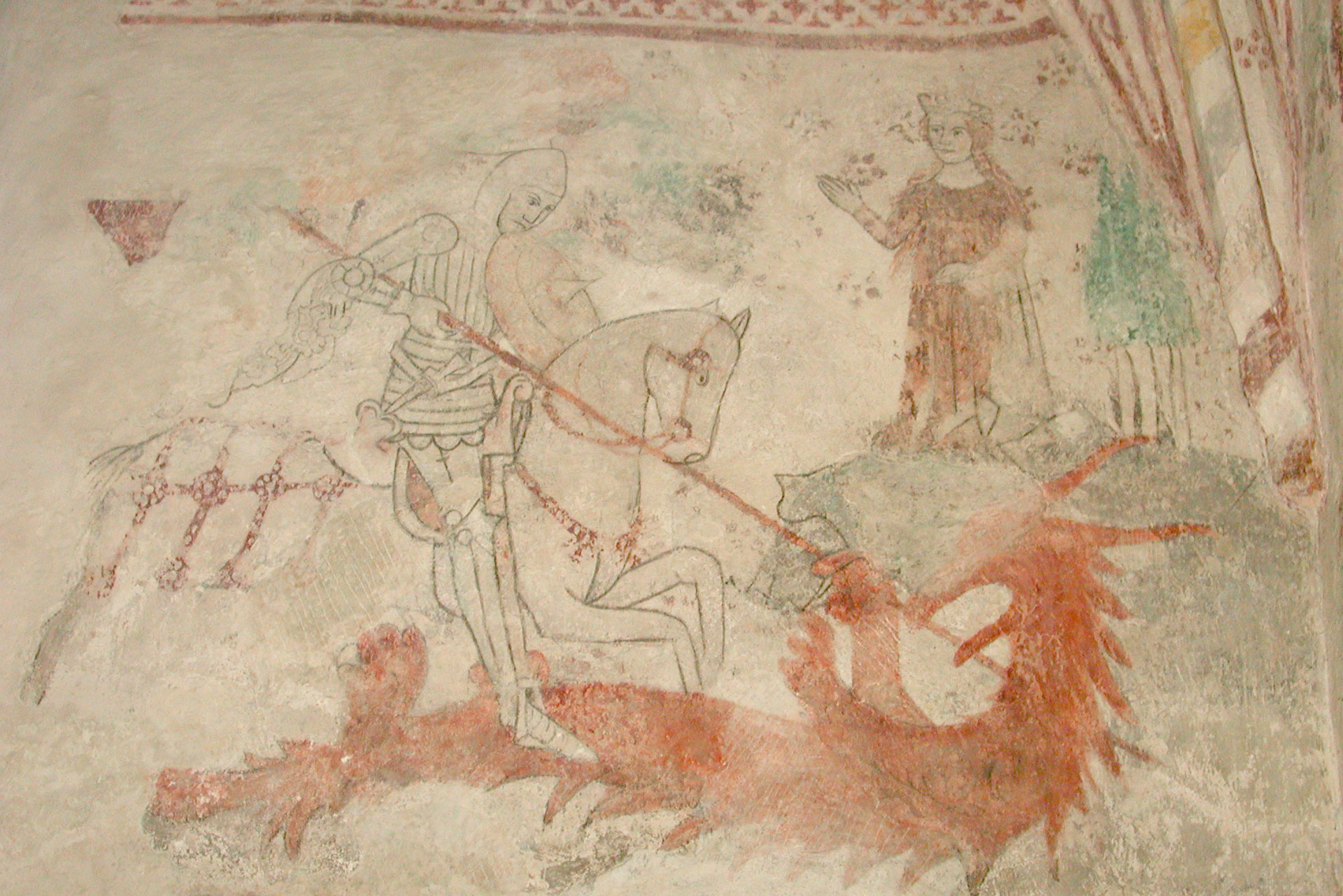 Just då kom draken gående ur sjön, vred och fasansvärd, så att jungfrun av räddhåga nästan dånade vid hans åsyn. Men Sankt Göran gjorde korstecknet för sig och red emot draken och stack honom genom halsen med sitt spjut.