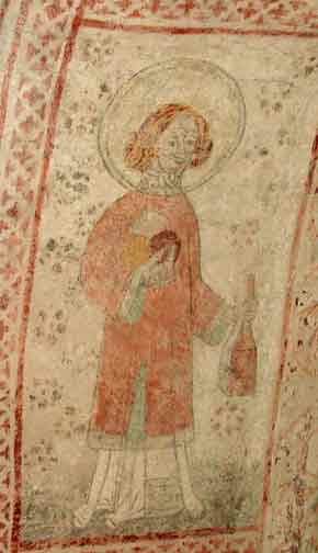 På bilden syns Stefanos klädd som en medeltida diakon (jämför hans klädsel med Sankt Lars som också finns avbildad i kyrkans triumfbåge!). Det flaskliknande föremål som Stefanos håller i vänster hand ska föreställa en bokpåse, alltså en typ av förvaring man använde på medeltiden när man skulle bära med sig böcker. Det som ser ut som tre klot i olika färger som Stefanos håller i höger hand föreställer stenar, och ska symbolisera att han stenades till döds.
