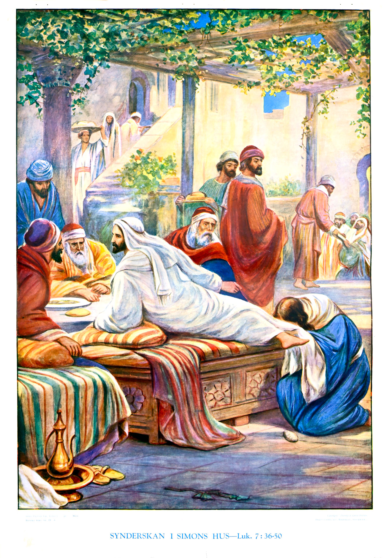 Simon svarade: »Den som fick mest efterskänkt, skulle jag tro.« – »Du har rätt«, sade Jesus, och vänd mot kvinnan sade han till Simon: »Du ser den här kvinnan. Jag kom in i ditt hus, och du gav mig inte vatten till mina fötter, men hon har vätt mina fötter med sina tårar och torkat dem med sitt hår. Du gav mig ingen välkomstkyss, men hon har kysst mina fötter hela tiden sedan jag kom hit. Du smorde inte mitt huvud med olja, men hon har smort mina fötter med balsam.