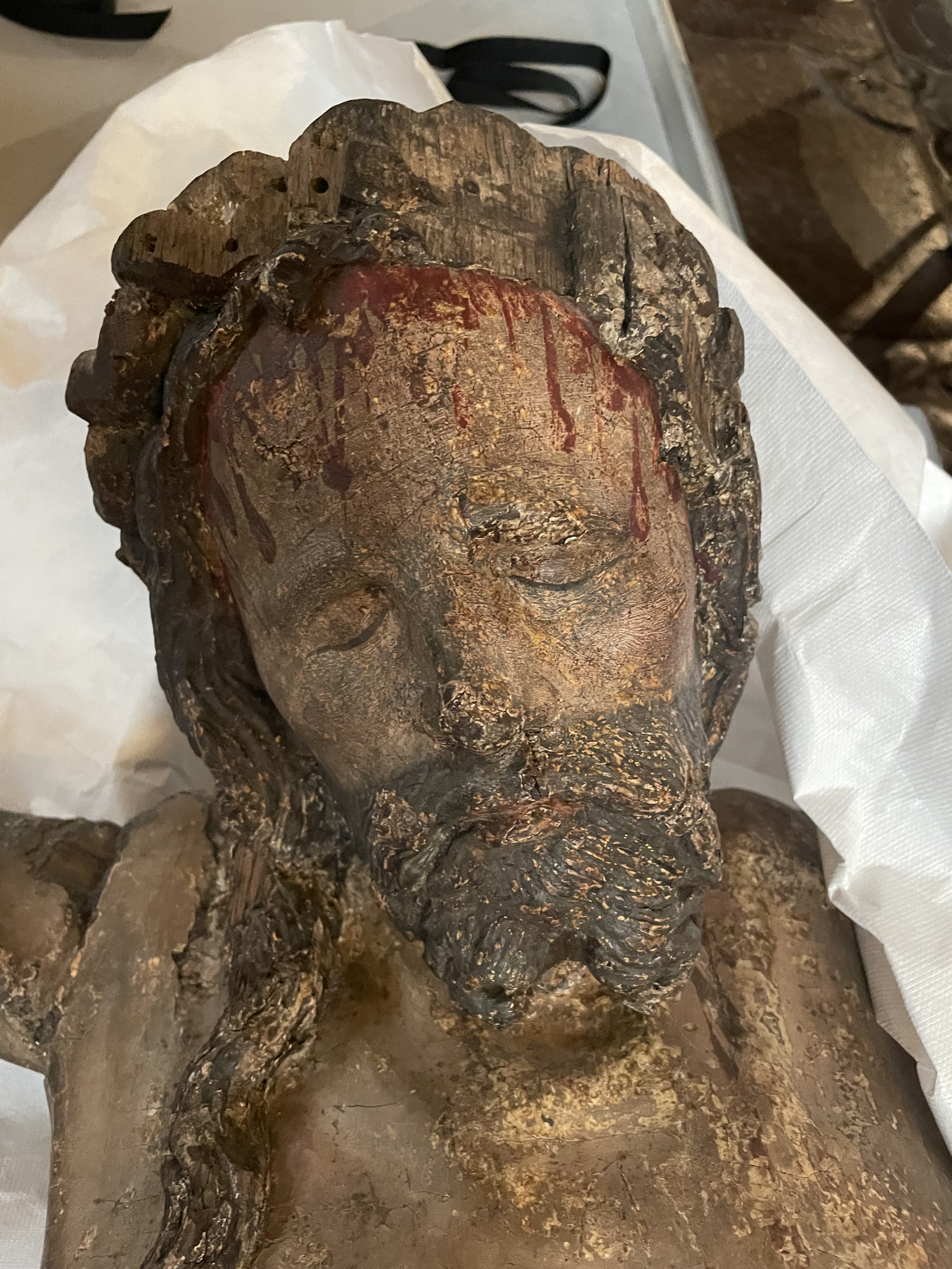 Medeltidsmuseet kom i dagarna bärandes på krucifixet från 1400-talet som de lånat i 40 år. Nu hänger det i Olaus Petri kapellet. Här finns bilderna från hängningen.