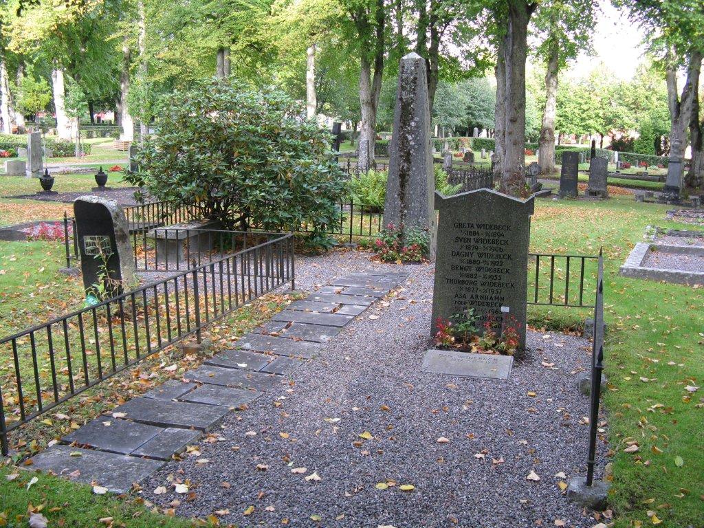 Stor grusad gravvård som omgärdas av ett enkelt järnstaket. Hög obeliskformad gravsten. Intill gravstenen finns en stenbänk och en rhododendron buske. Gravvården är en familjegrav uppsatt för läroverksadjunkten August Widebeck och hustrun telegrafisten Augusta Widebeck.