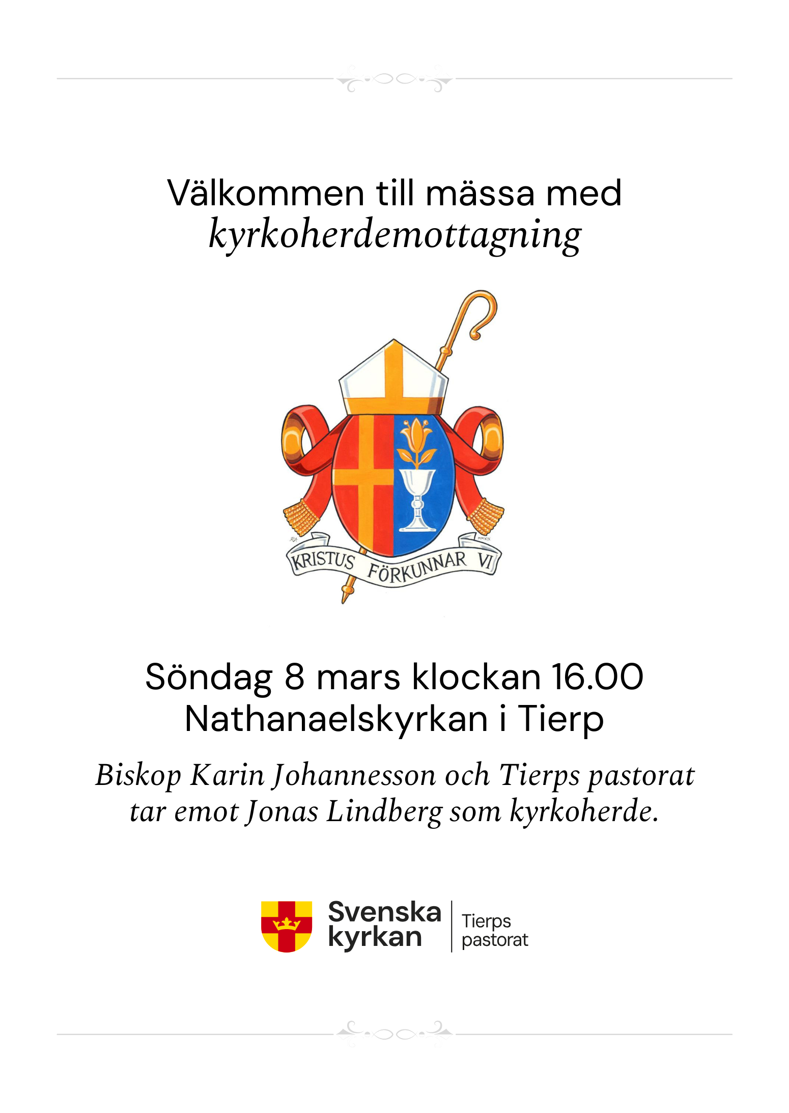 Söndagen den 8 mars, tredje söndagen i fastan, firar vi mässa i Nathanaelskyrkan då Biskop Karin Johannesson och Tierps pastorat tar emot Jonas Lindberg som kyrkoherde. Varmt välkommen att delta.