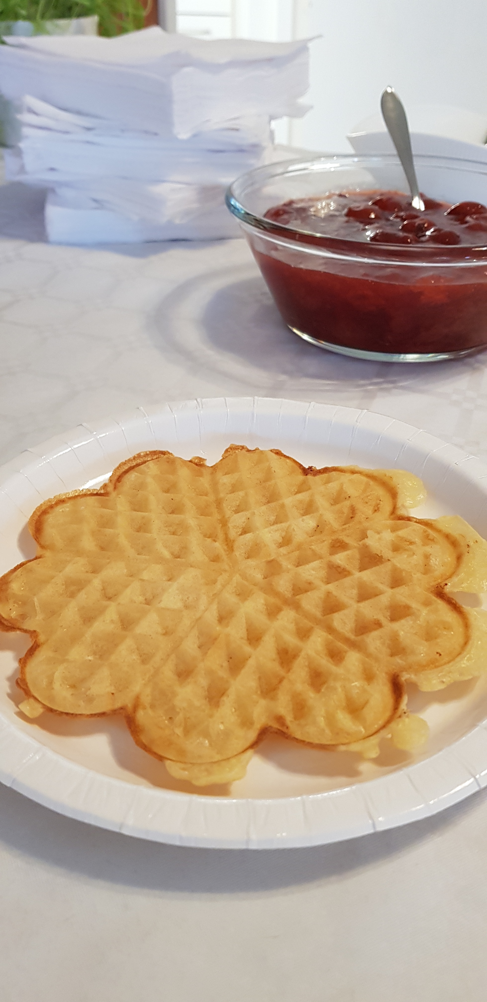 I lugn miljö finns möjlighet att avnjuta kaffe/the Våffla med grädde och sylt.