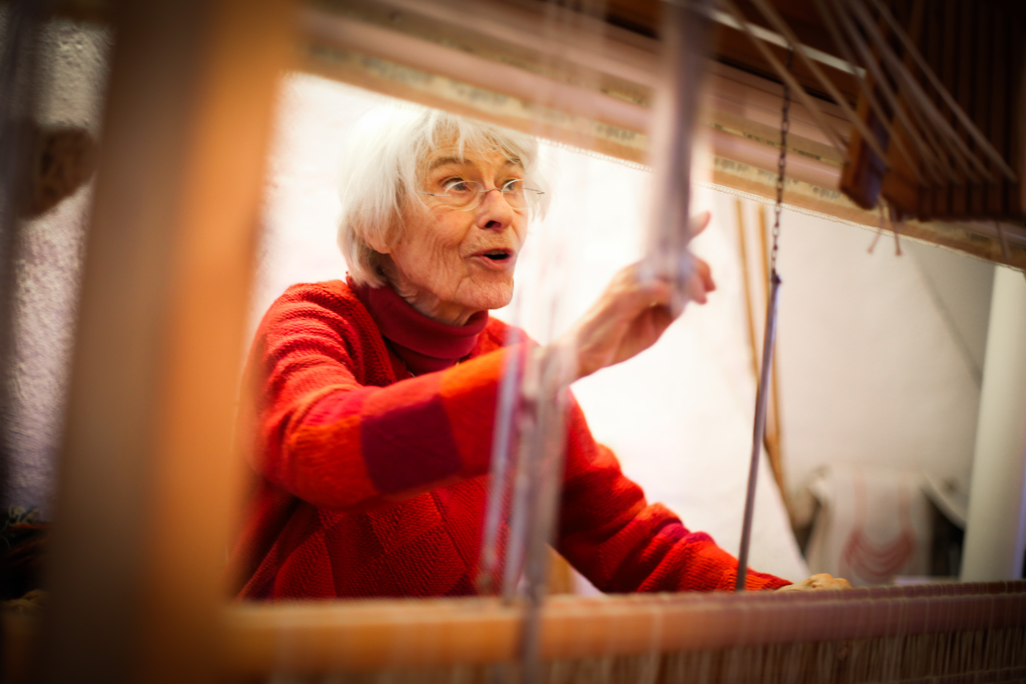 Den stora vävstolen tar upp en betydande del av Gunilla Sjögrens ateljé. Den har många trampor och går att använda till flera olika vävtekniker. Från vävstolen hänger fem gamla orgelpipor som Gunilla fått av en orgelbyggare. En påminnelse om de sakrala platser som hennes konst skapas för. Här, på vinden i radhuset i Örgryte i Göteborg, har hon skapat många av de verk som pryder kyrkor, kapell och församlingshem runt om i Sverige. Hon har bott i det här huset sedan nästan 50 år och varenda yta är smyckad med hennes konst. Här finns skisser från stora och små projekt, akvareller, ikoner och broderier. På sina håll är mönster, bilder och budskap målade som muralmålningar direkt på väggen eller på trappornas sättsteg. På hedersplatsen i finrummet hänger en inramad skiss på ett välbekant motiv, altarbilderna från Dalabergskyrkan i Uddevalla.