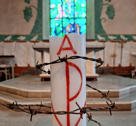 På altaret står inga ljus samt fem röda rosor