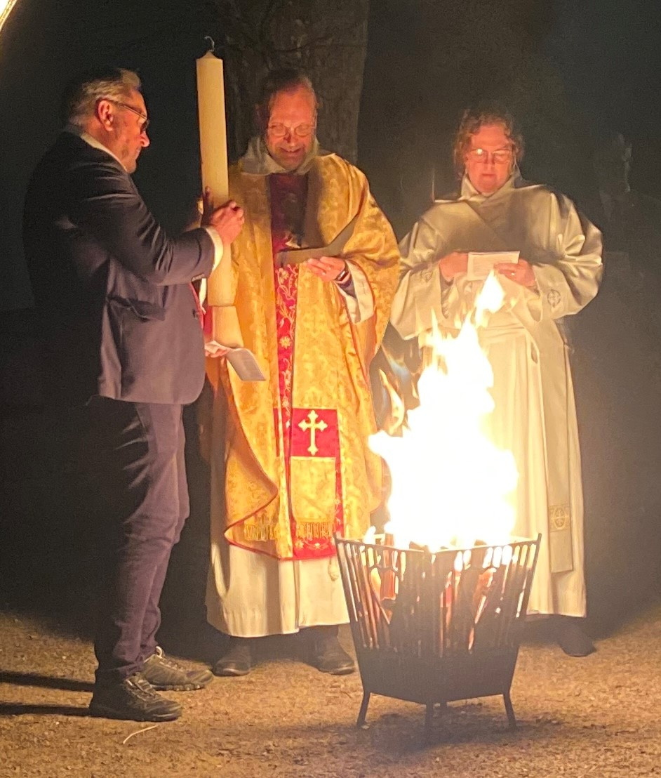 Vi samlas utanför kyrkan i mörkret och tänder påskljuset.