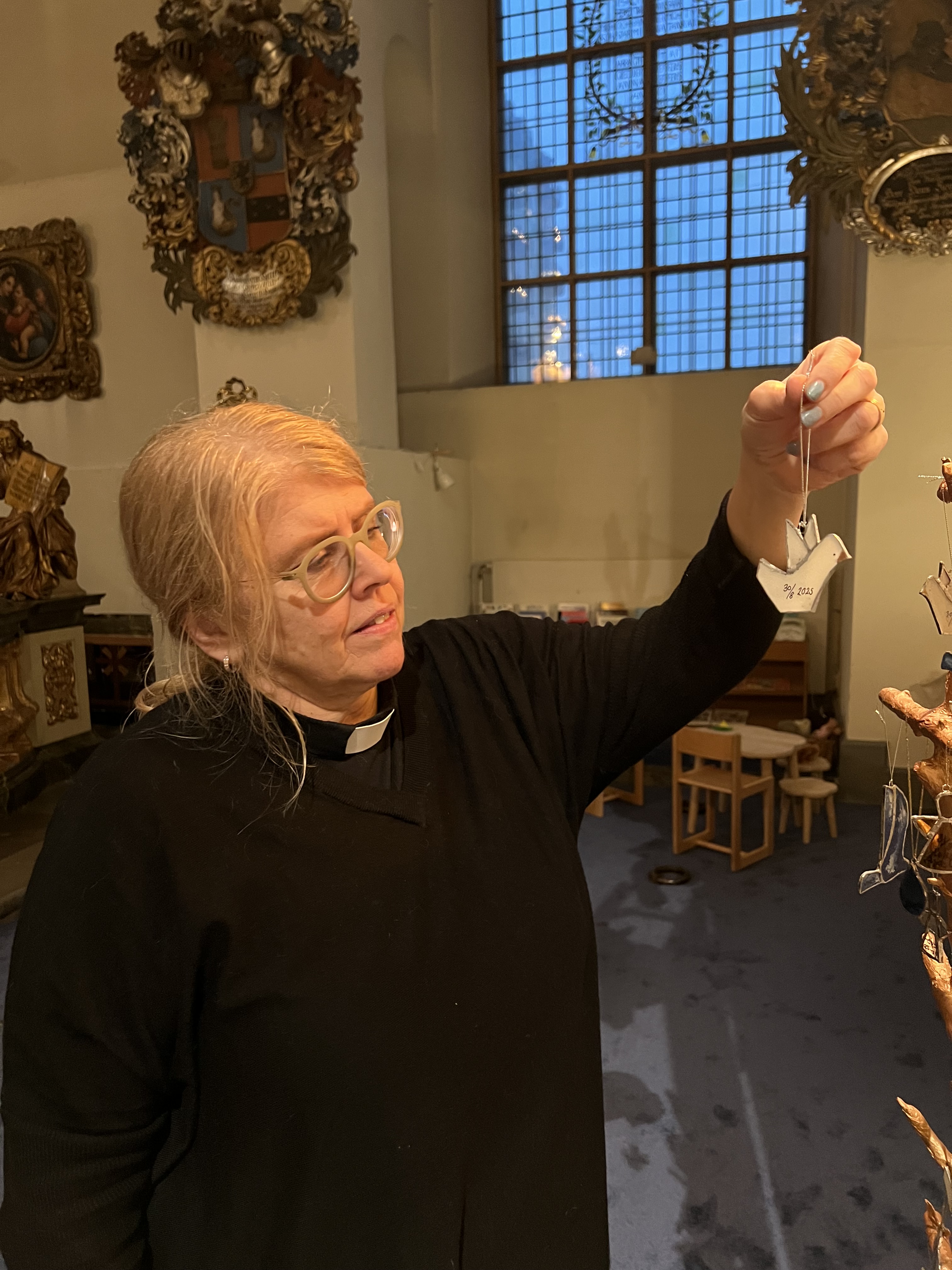 Några månader efter ditt dop bjuder församlingen in dig till dopfest och vid det tillfället återfår du din glasfigur. Glasfigurerna är tillverkade i Betlehem och föreställer duvor, änglar eller droppar. Eva Åhlander som är präst i Västermalms församling, och även konstnär, har tillverkat stegarna och berättar: