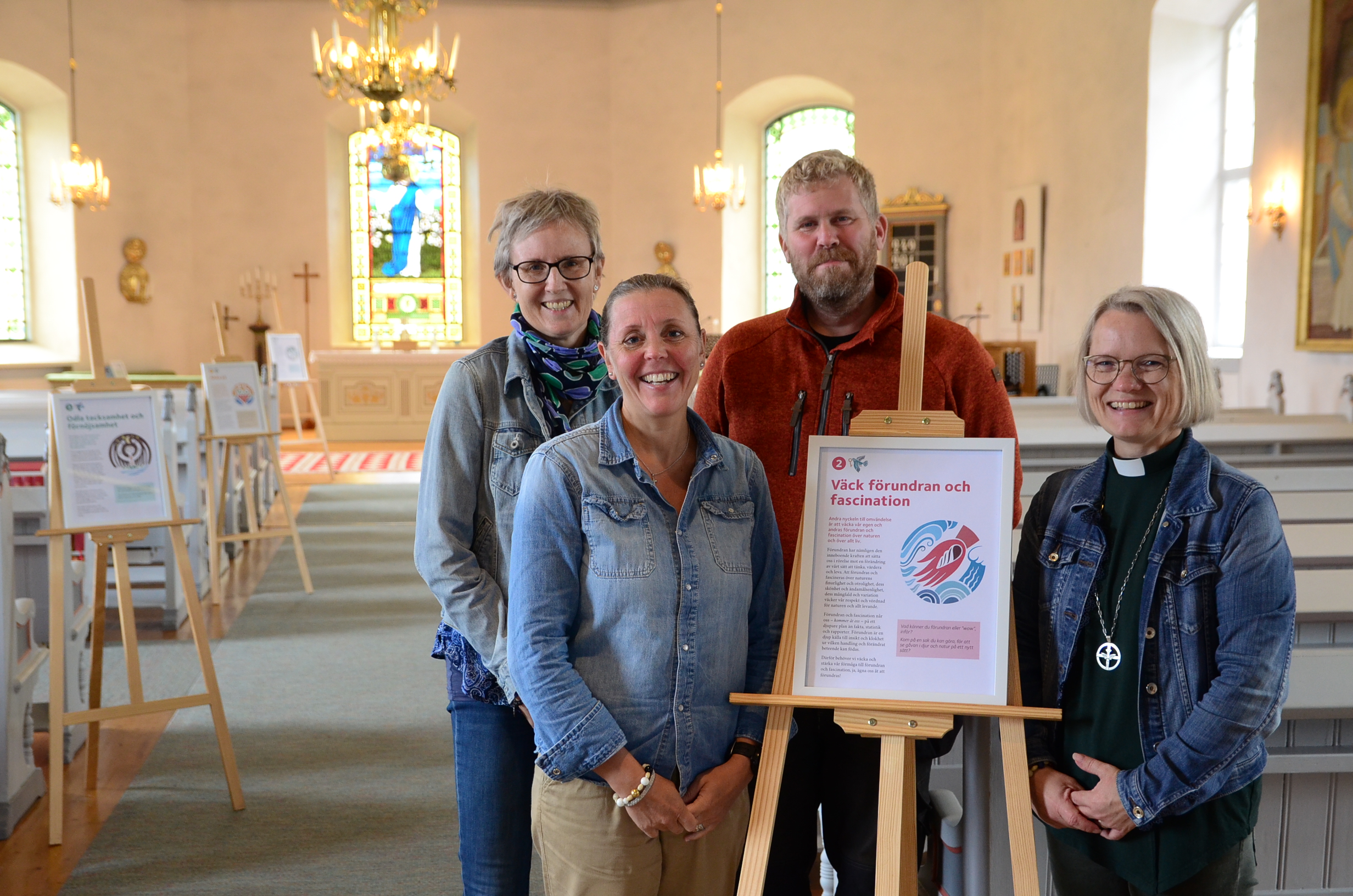 I Vislanda kyrka har delar av arbetslaget samlats för att rigga utställningen som bygger på sju nycklar från biskop Andreas Holmbergs herdabrev ”Gud såg att det var gott”. Detta inför helgens familjedag för hela församlingen, ”Blomstra för Guds skull”.