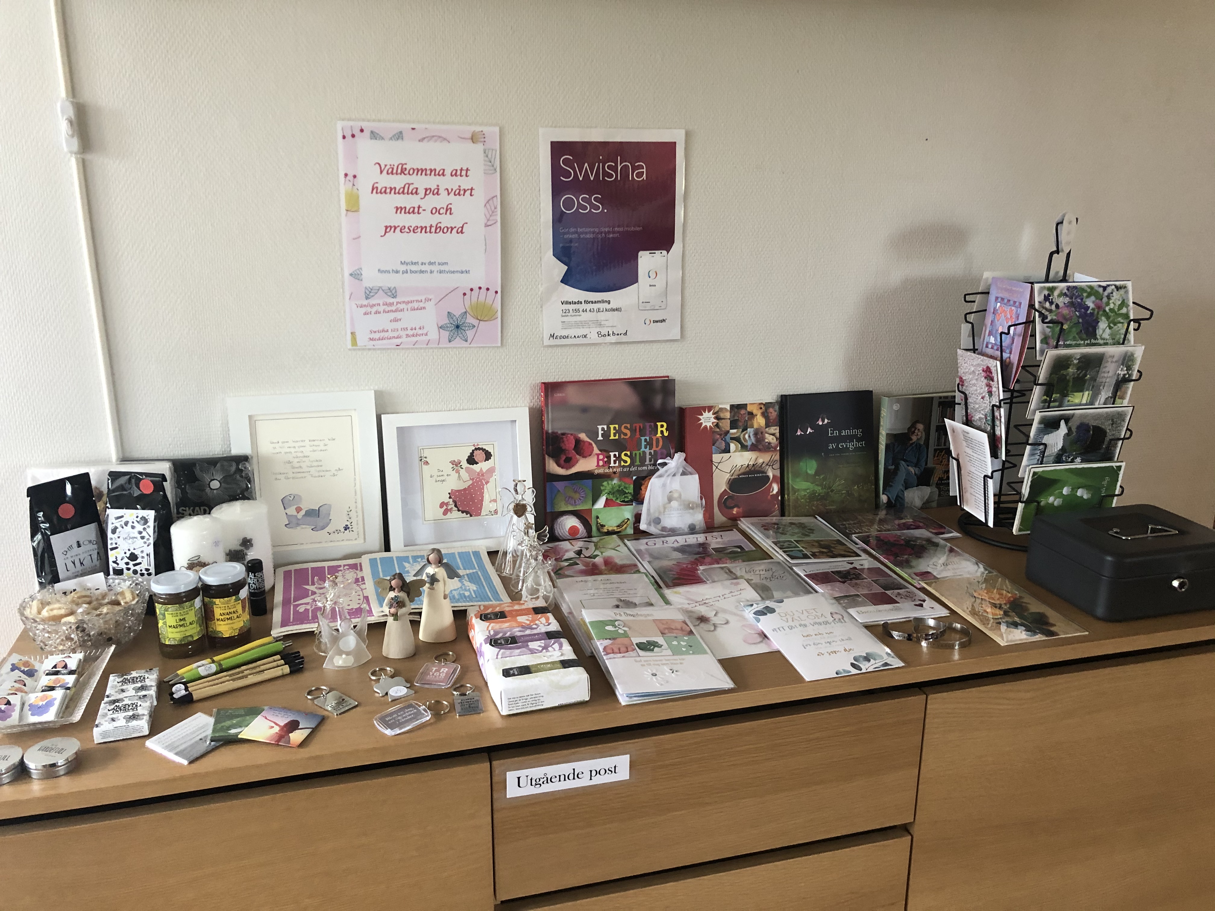 Bokbordet hittar ni utanför musiksalen bredvid hissen i Smålandsstenars församlingshem.