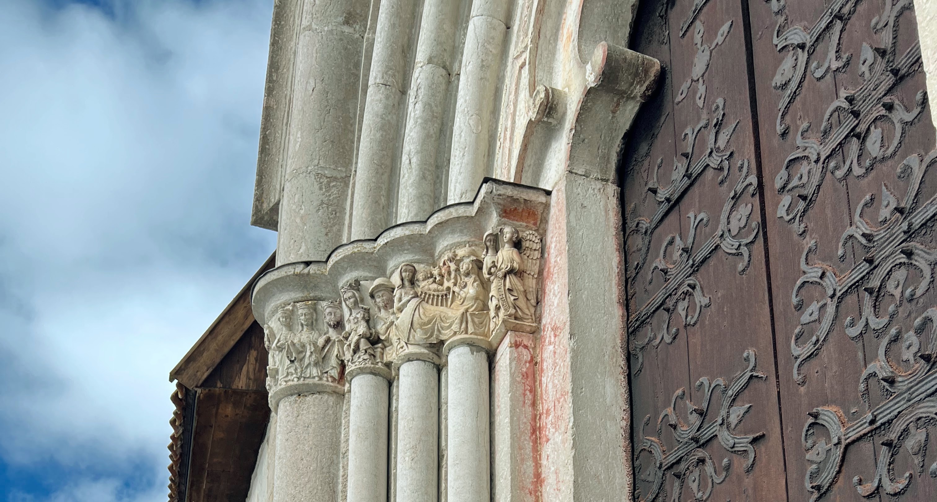 Maria bebådelse finns avbildad på många ställen i Gotlands nästan 100 medeltida kyrkor till exempel som på bilden som visar en 1200-talsskulptur i kyrkporten till Bro kyrka.