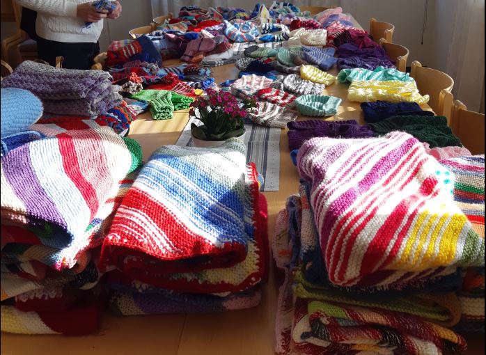 Sticka-gruppen överlämnar sina stickade alster till Missionskyrkans insamling. Dessa skickas sedan för vidare transport till Ukraina och andra behövande i länderna i öst.